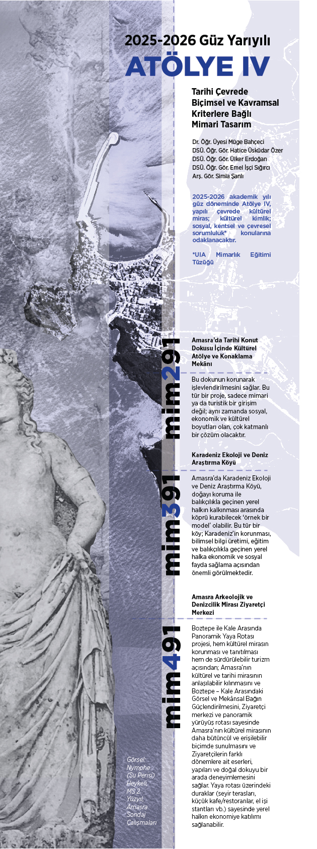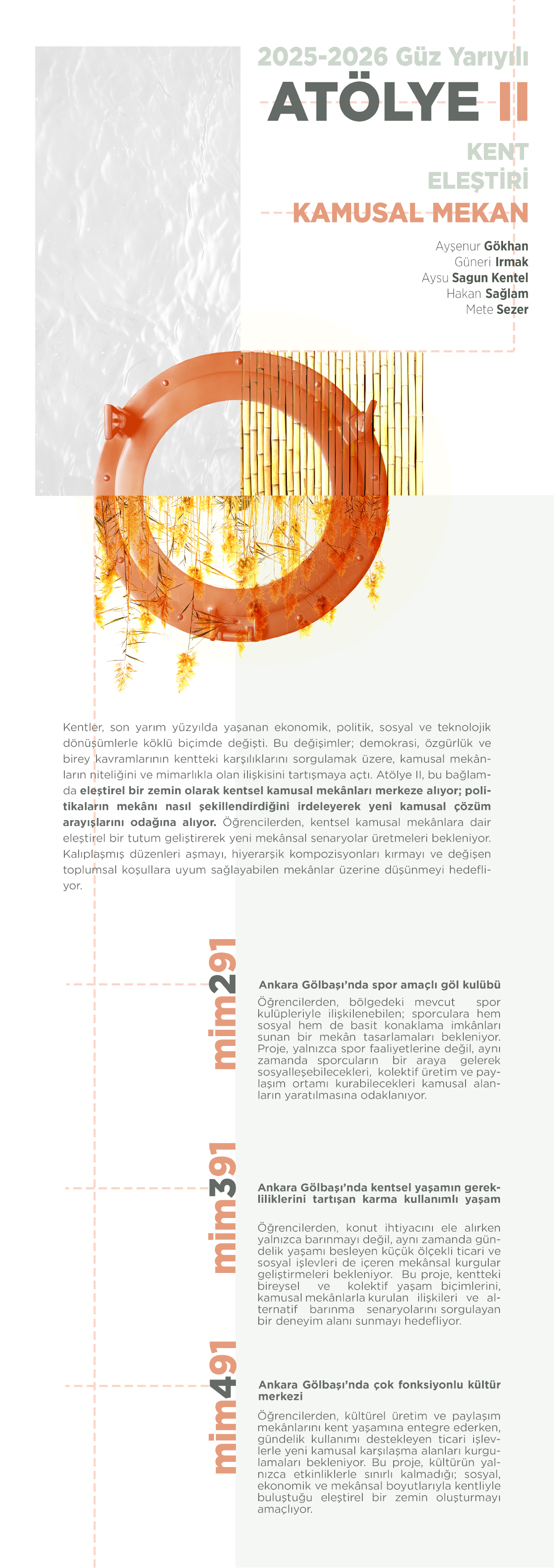 2025-2026 Akademik Yılı Güz Dönemi Mimarlık Tasarım Stüdyoları Düşey Atölye Posterleri aşağıda paylaşılmıştır. Yeni dönemde tüm öğrencilerimize başarılar dileriz.