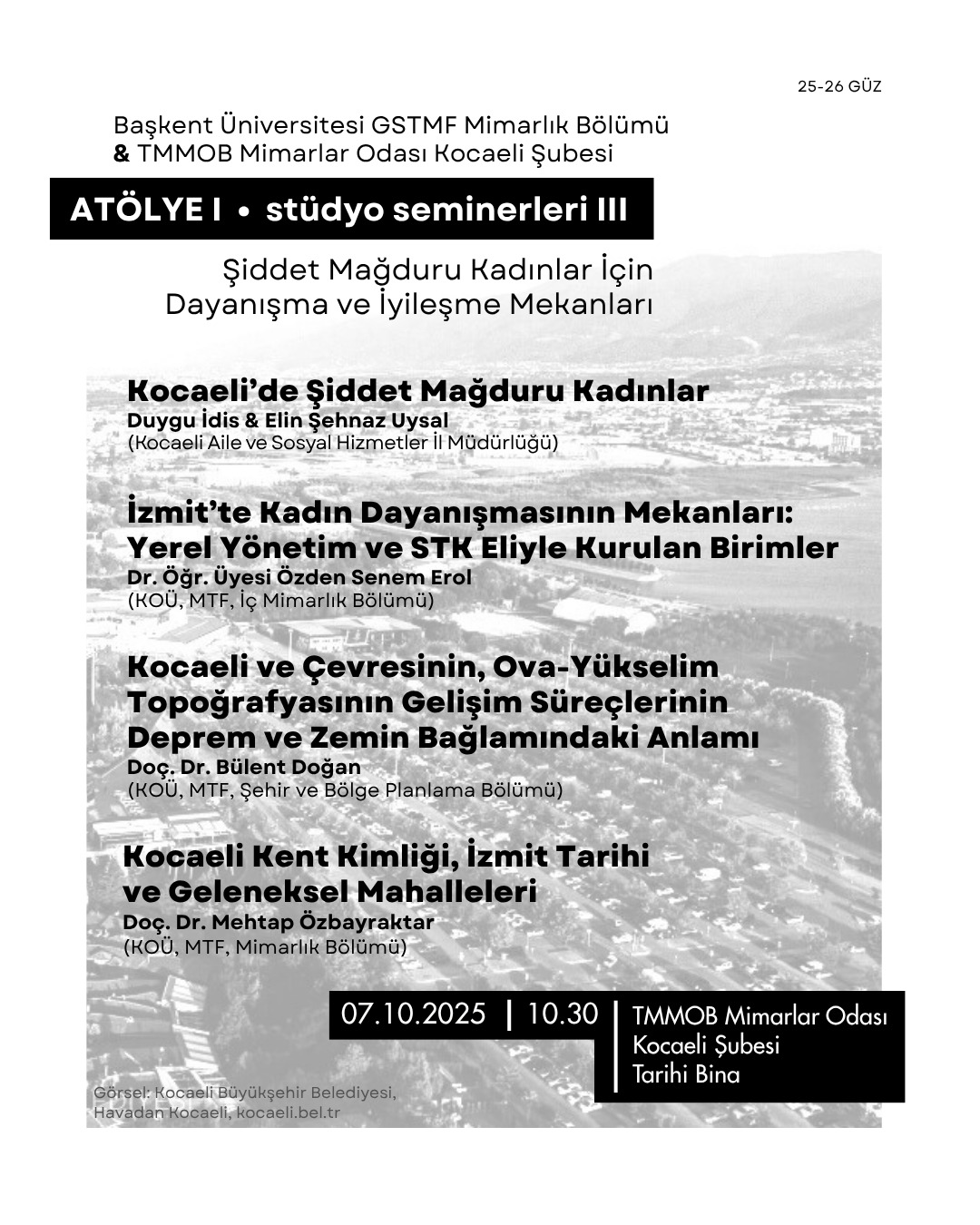 Başkent Üniversitesi Mimarlık Bölümü ve TMMOB Mimarlar Odası Kocaeli Şubesi işbirliğiyle 07 Ekim 2025 Salı günü TMMOB Mimarlar Odası Kocaeli Şubesi'nde, Atölye IV 2024-25 Güz Dönemi proje teması 'Şiddet Mağduru Kadınlar için Dayanışma ve İyileşme Mekanları' odağında sunuşlar gerçekleştirilecektir.