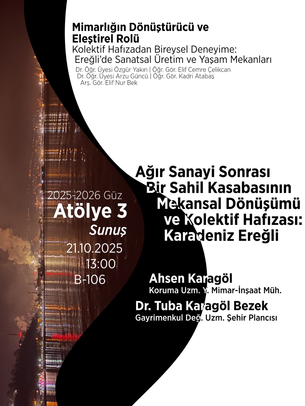 Atölye III dersi kapsamında, Ahsen Karagöl ve Dr. Tuba Karagöl Bezek tarafından ''Ağır Sanayi Sonrası Bir Sahil Kasabasının Mekansal Dönüşümü ve Kolektif Hafızası: Karadeniz Ereğli'' başlıklı sunuş 21.10.2025 saat 13.00'da B-106 no'lu derslikte yapılacaktır.
