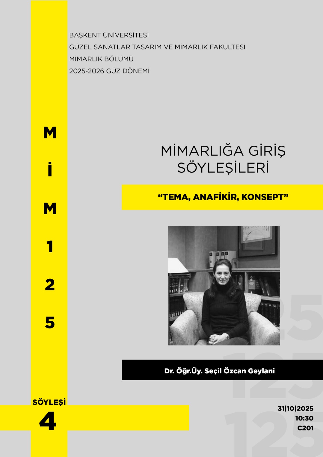 MİM125 Mimarlığa Giriş Dersi kapsamında 31 Ekim 2025 Cuma günün saat 10.30'da C-201 no'lu derslikte Dr.Öğr. Üyesi Seçil Özcan Geylani tarafından 'Tema, Anafikir, Konsept' başlıklı söyleşi gerçekleştirilecektir.