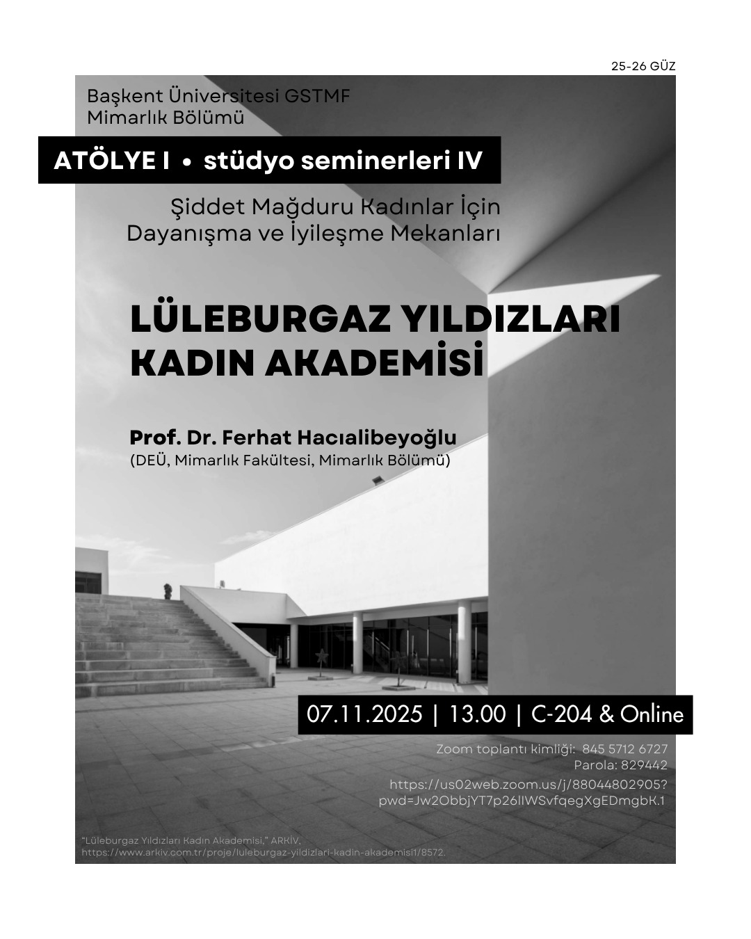Atölye I dersi kapsamında 07 Kasım 2025 Cuma günü Prof.Dr. Ferhat Hacıalibeyoğlu tarafından ''Lüleburgaz Yıldızları Kadın Akademisi'' başlıklı sunuş C-204 No'lu derslikte saat 13.00'da yapılacaktır.