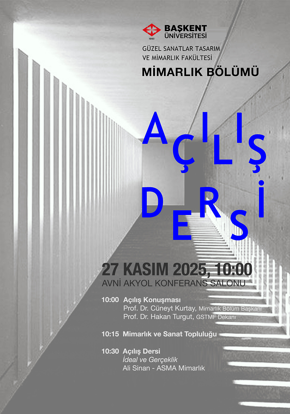 Açılış Dersi 2025 ASMA Mimarlık kurucusu Ali Sinan tarafından 27 Kasım 2025 Perşembe günü saat 10.30'da Avni Akyol Konferans Salonu'nda yapılacaktır.