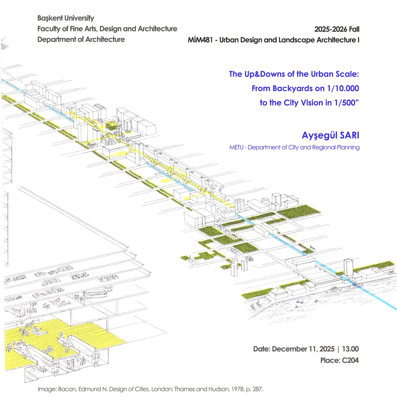 Prof.Dr. Nuray Bayraktar ve Arş. Gör. Aysema Ülke tarafından yürütülen MIM481- Urban Design and Landscape Architecture I dersi kapsamında, ODTÜ Şehir ve Bölge Planlama Bölümü doktora öğrencisi ve araştırma görevlisi Ayşegül Sarı'nın ''The Ups&Downs of the Urban Scale: From Backyards on 1/10.000 to the City in the Vision in 1/500'' başlıklı sunuşu 11 Aralık 2025 Perşembe günü saat 13.00'da C-204 No'lu stüdyoda yapılacaktır.