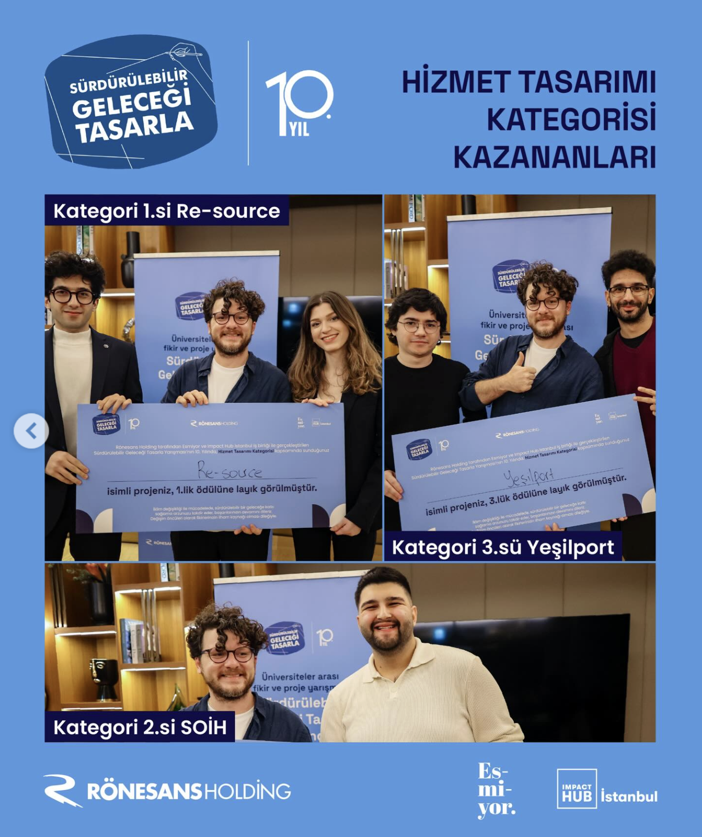 Mimarlık Bölümü öğrencilerinden Numan Sevim ile Ankara Medipol Üniversitesi Bilgisayar Mühendisliği bölümü öğrencisi Esma Çobanoğlu’nun ortaklaşa hazırladığı "Re-source: Döngüsel Ekonomi Dijital Pazar Yeri" projesi, Rönesans Holding’in bu yıl onuncusunu düzenlediği "Sürdürülebilir Geleceği Tasarla" yarışması Hizmet Tasarımı kategorisinde 1.lik ödülüne layık görülmüştür.